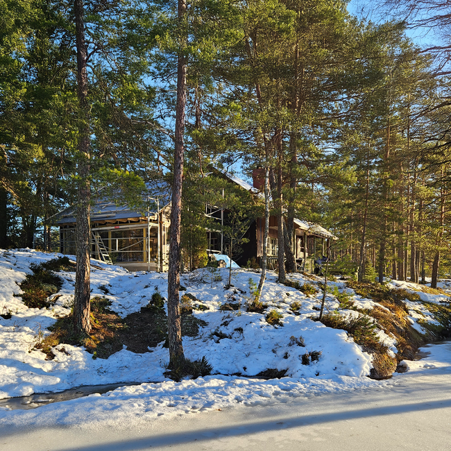 Over denne er stolper og vindusbånd en videreføring av trestammene. Som gir utsyn og slipper lyset gjennom. Øverst er taket den omsluttende trekronen. Luftig og intimt, på en og samme tid.